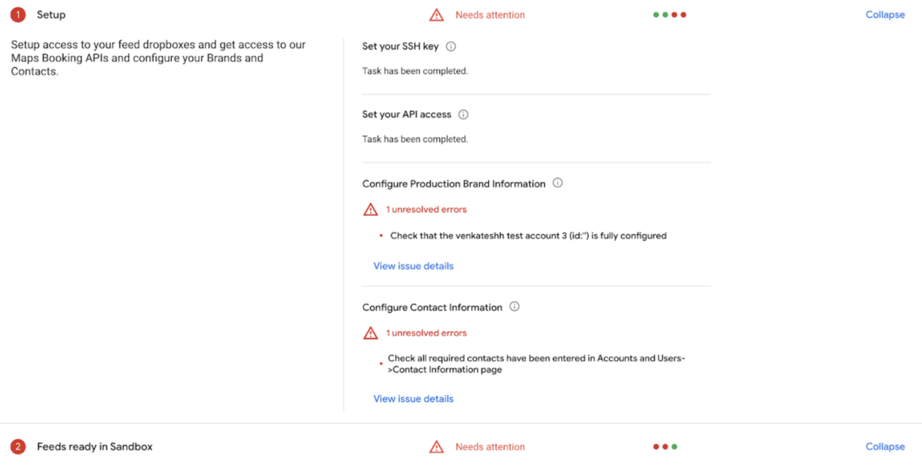- Needs Attention (Red): The task is not passing the success criteria and needs attention. This could be because you have not begun to work on this aspect of the integration yet.
