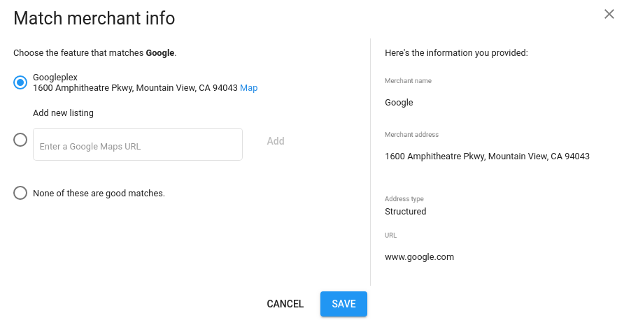 To improve merchant matching, you can use the Partner Portal to suggest a url for a business listing on Google Maps. The Actions Center will use that information as a suggestion to create a new matching candidate.