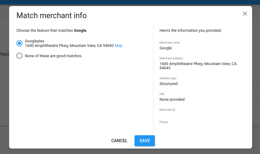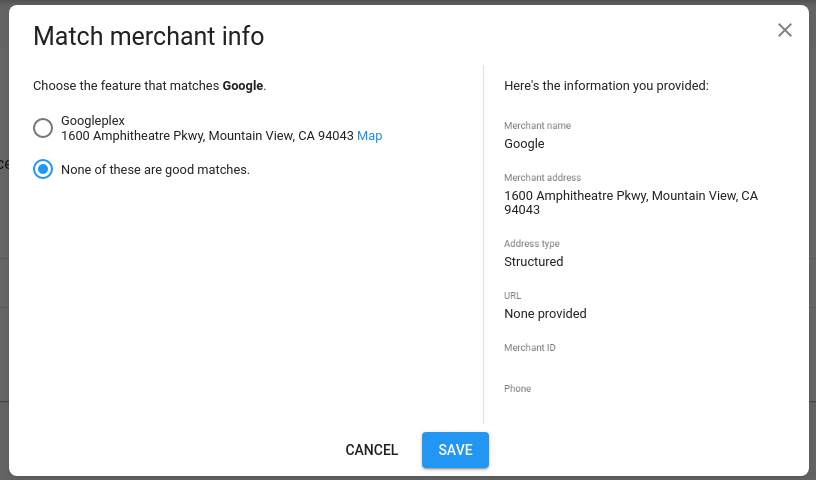 | Unmatched | Merchant data is processed, but no suitable matching Google Maps features have been found. Alternatively, potential matches might be in the middle of manual review. |