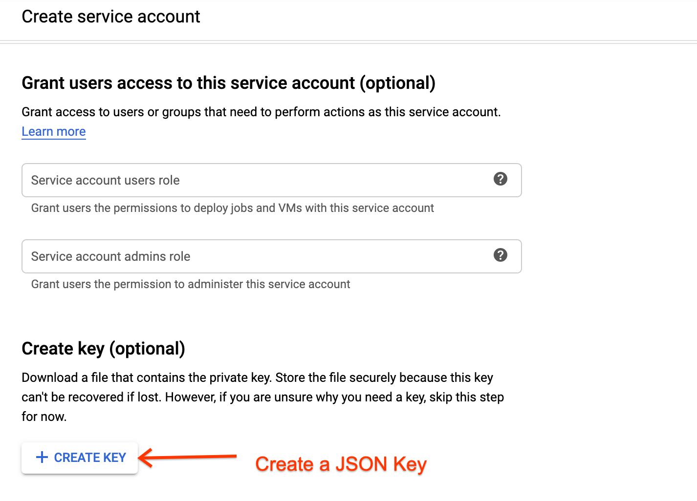 Create a service account with appropriate roles and save the generated JSON credentials securely.