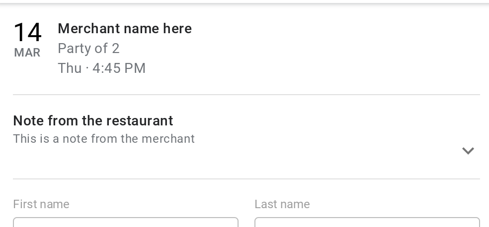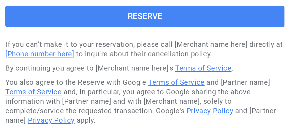 [[["Easy to understand","easyToUnderstand","thumb-up"],["Solved my problem","solvedMyProblem","thumb-up"],["Other","otherUp","thumb-up"]],[["Missing the information I need","missingTheInformationINeed","thumb-down"],["Too complicated / too many steps","tooComplicatedTooManySteps","thumb-down"],["Out of date","outOfDate","thumb-down"],["Samples / code issue","samplesCodeIssue","thumb-down"],["Other","otherDown","thumb-down"]],["Last updated 2025-09-18 UTC."],[],["Merchants can add specific terms by using the `merchant.terms.text` and `merchant.terms.url` fields. The text will display in the merchant's overview and booking modal. The URL, linked as \"Terms of Service,\" will be at the bottom of the booking modal. This JSON example shows how to define both fields, including a sample URL and text. The terms of service text is fixed and not configurable.\n"]]