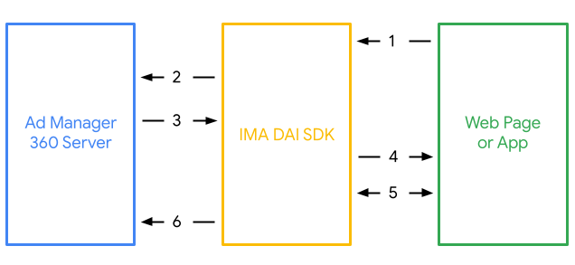 The following diagram illustrates and annotates the interactions between your video player, the IMA DAI SDK, and Ad Manager 360.