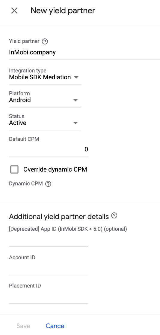 Select the company you created for InMobi in the previous section. Choose Mobile SDK mediation as the Integration type, Android as the Platform, and Active as the Status.