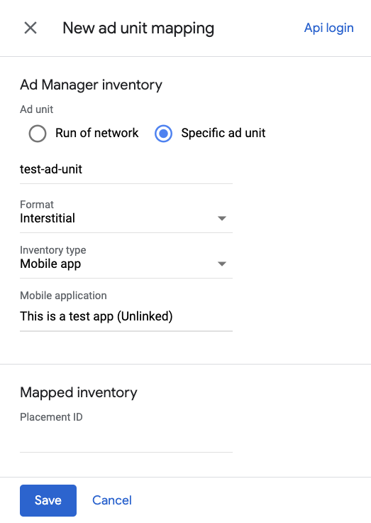 Choose Specific ad unit. Select an ad unit and format, Mobile app as the Inventory type, and your Mobile application. Then, enter Placement ID obtained in the previous section.