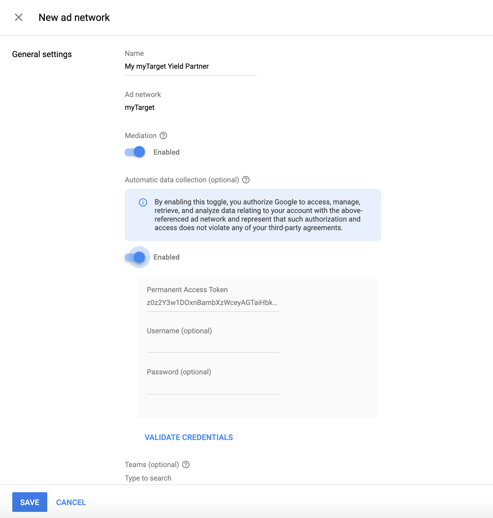 Select myTarget as the Ad network, enter a unique Name and enable Mediation.