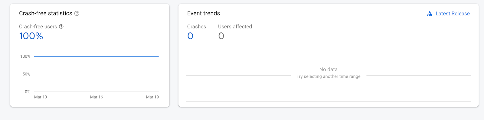 buildscript { repositories { // ... // Add Google's Maven repository. google() } dependencies { // ... classpath 'com.google.gms:google-services:4.4.4' // Add the Fabric Crashlytics plugin. classpath 'com.google.firebase:firebase-crashlytics-gradle:3.0.6' } } allprojects { // ... repositories { // Check that Google's Maven repository is included (if not, add it). google() // ... } }Build and run your app to make sure to make sure Crashlytics is configured correctly. Once successful, you will be able to access the Crashlytics dashboard.