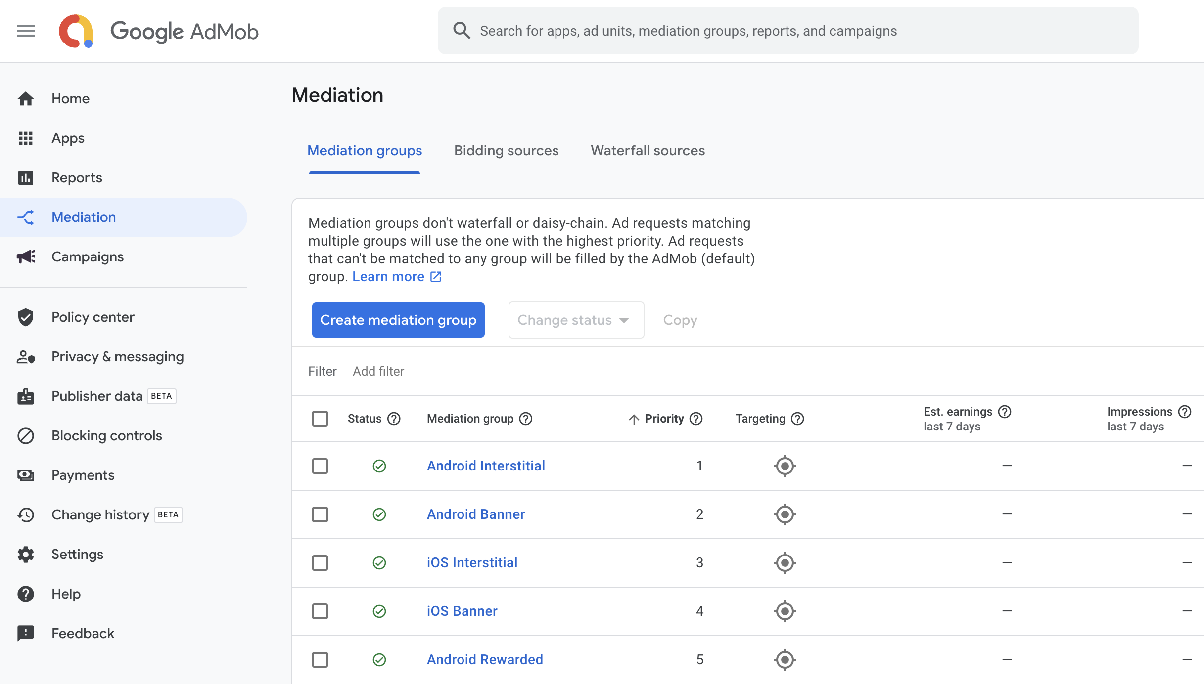 First, sign in to your AdMob account. Next, navigate to the Mediation tab. If you have an existing mediation group you'd like to modify, click the name of that mediation group to edit it, and skip ahead to Add LINE Ads Network as an ad source.