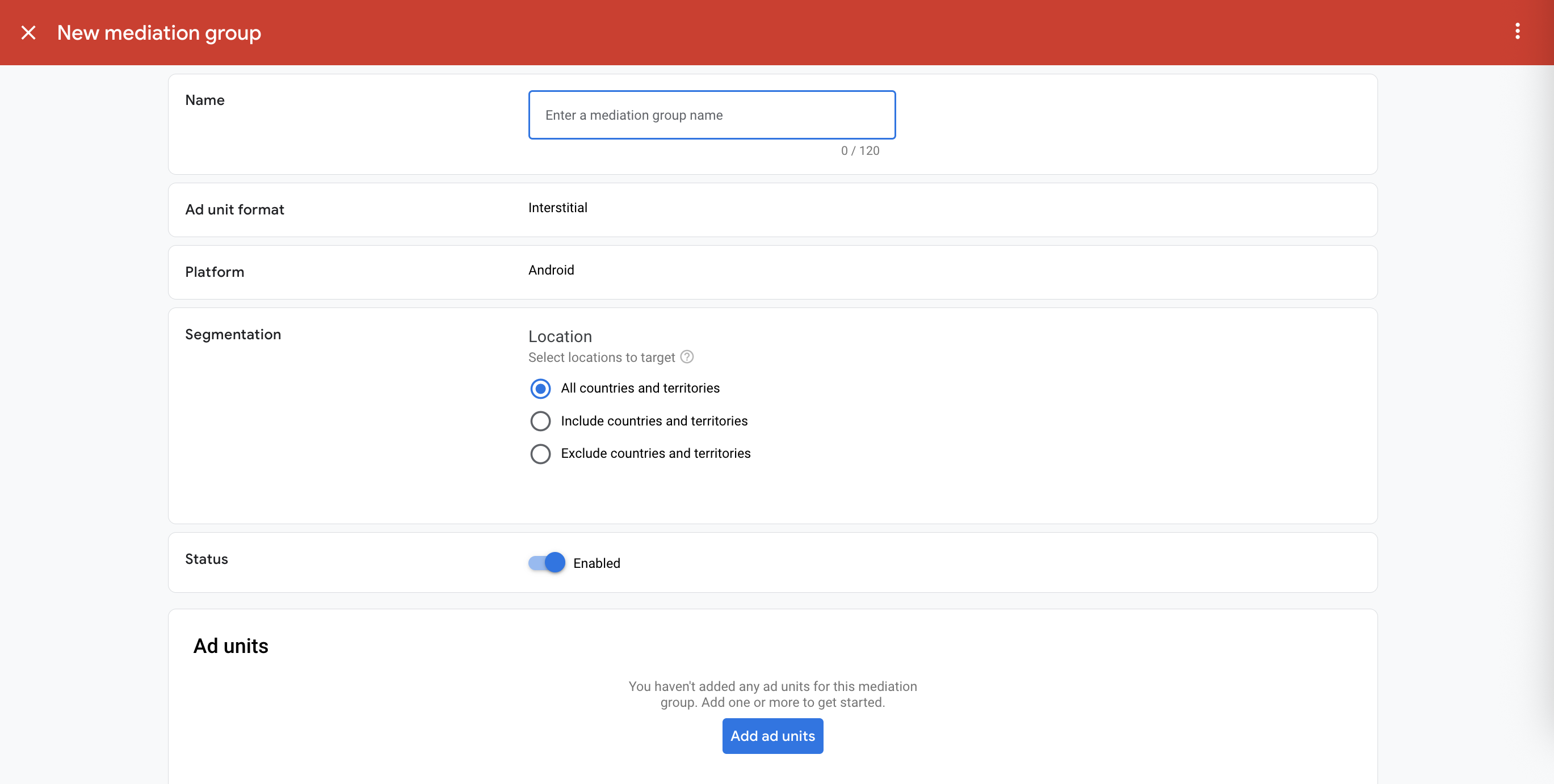 Give your mediation group a name, and select locations to target. Next, set the mediation group status to Enabled, and then click Add Ad Units.