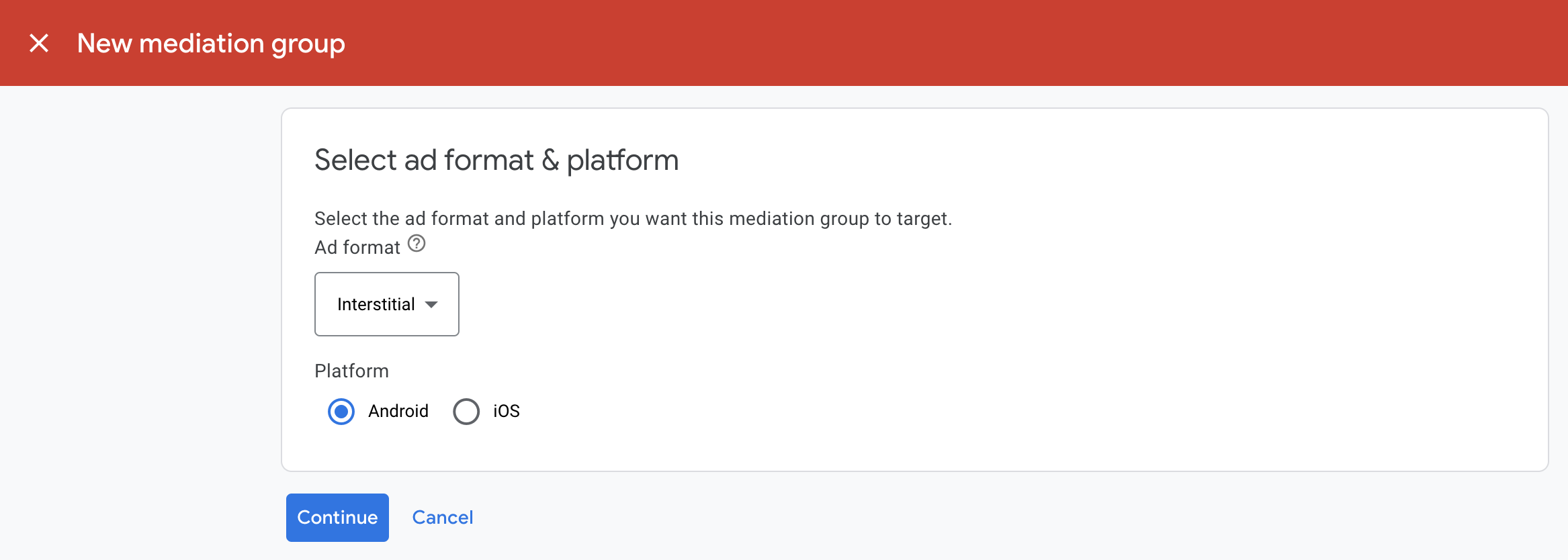 Enter your ad format and platform, then click Continue.