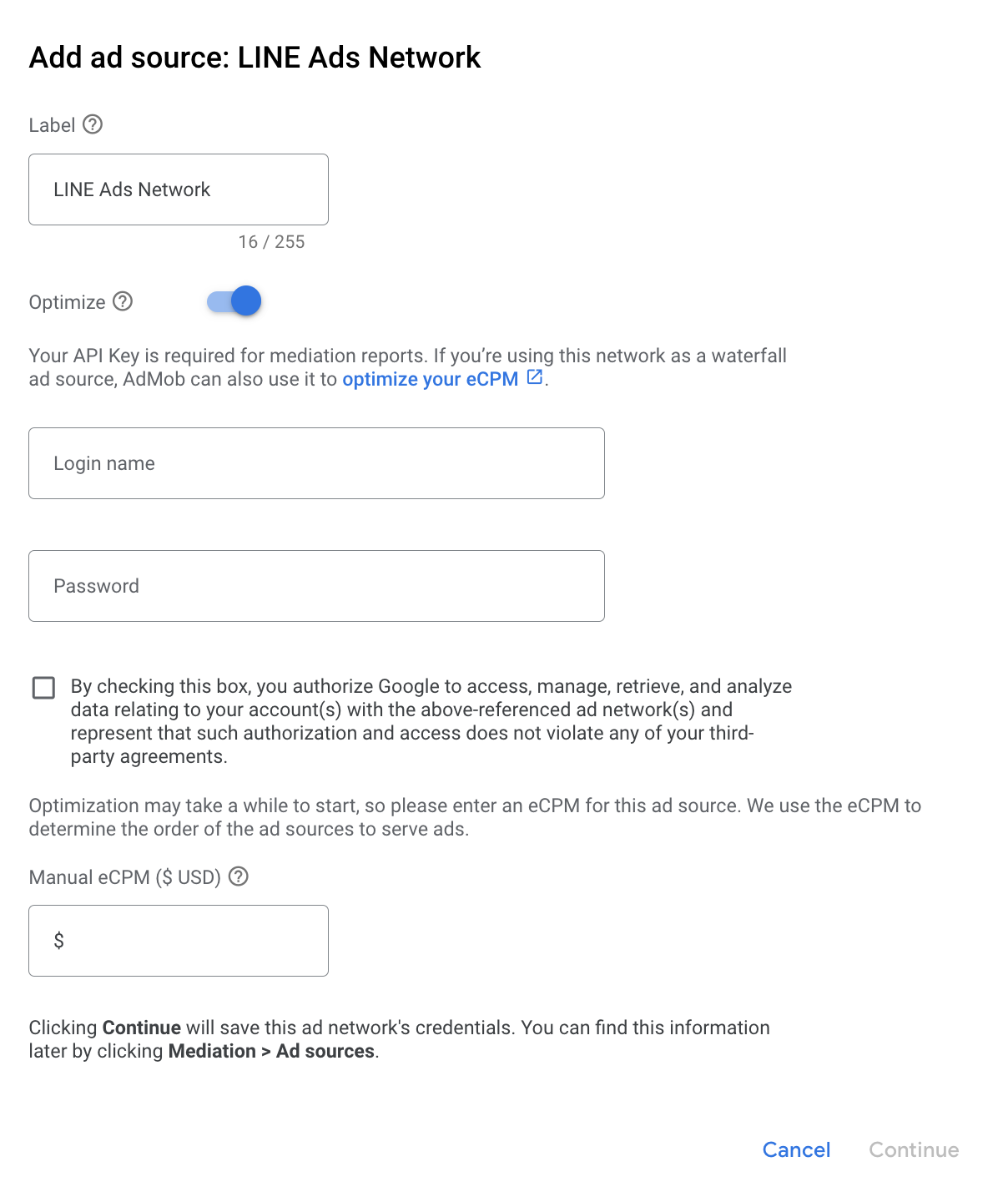 Select LINE Ads Network and enable the Optimize switch. Enter the Login name and Password obtained in the previous section to set up ad source optimization for LINE Ads Network. Then enter an eCPM value for LINE Ads Network and click Continue.