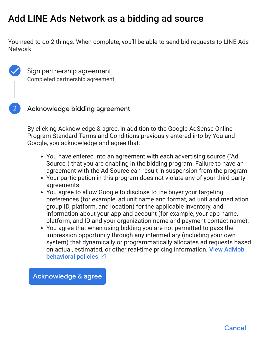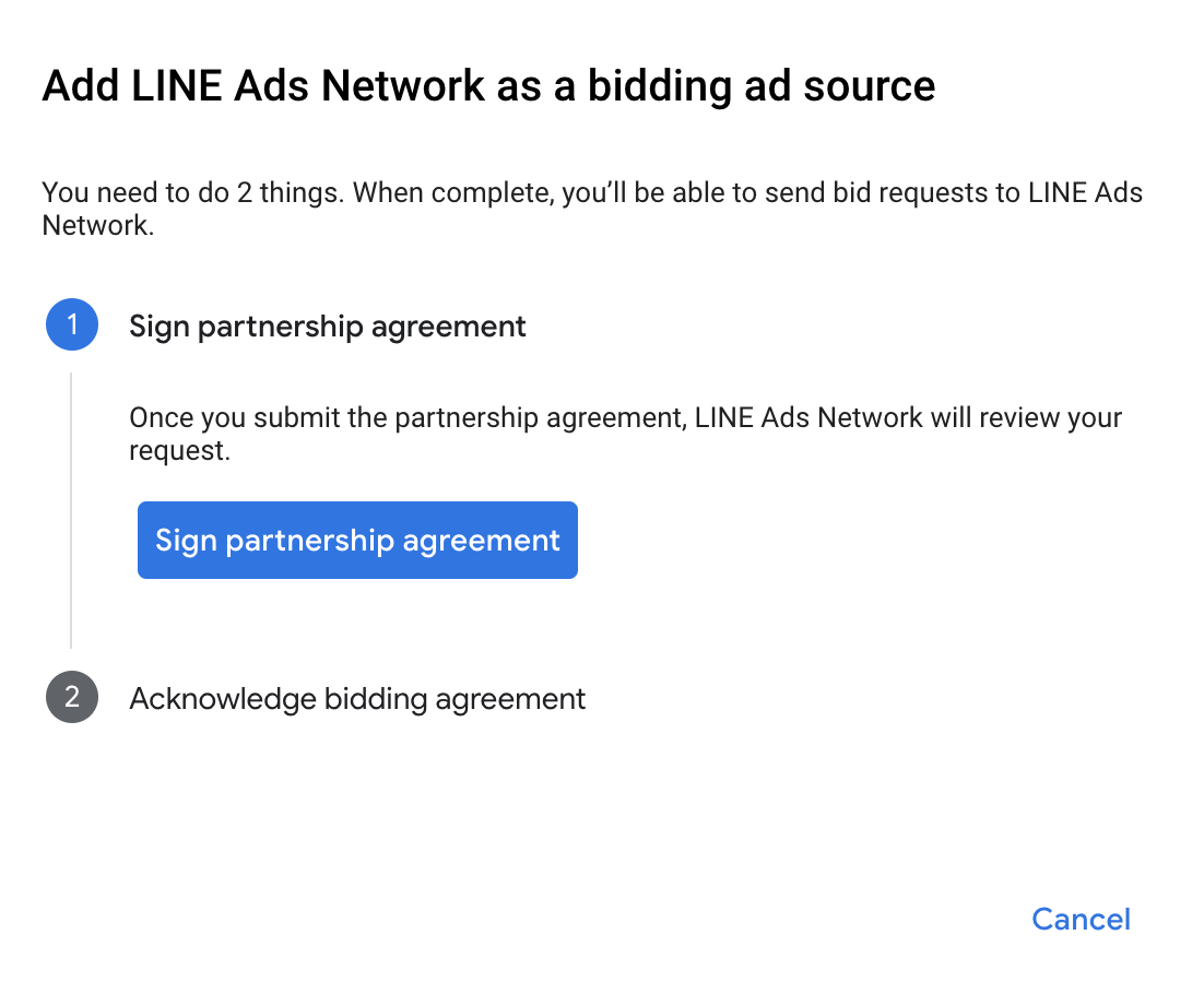 Under the Bidding card in the Ad Sources section, select Add ad source. Then select LINE Ads Network .Click How to sign a partnership agreement and set up a bidding partnership with LINE Ads Network.