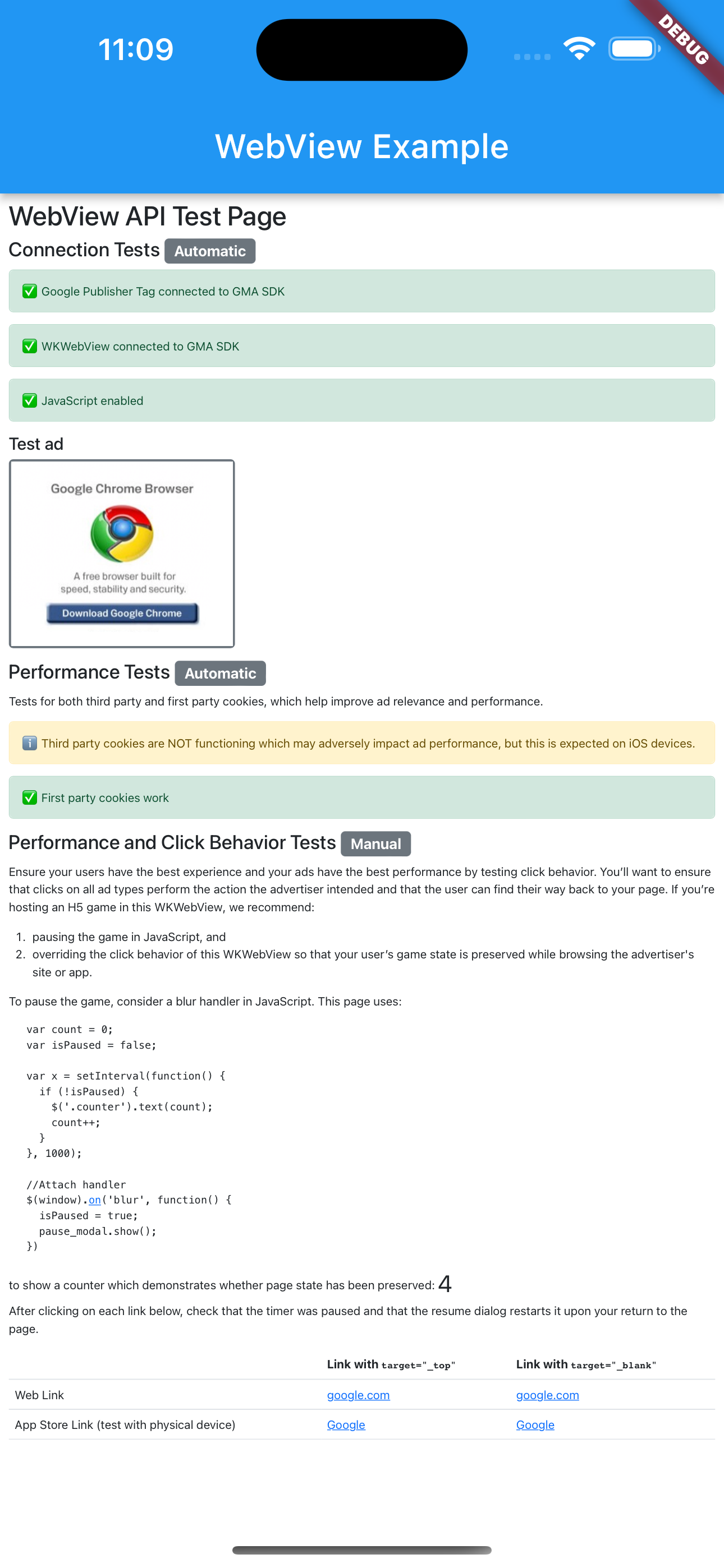 WebViewconnected to Google Mobile Ads SDK- JavaScript enabled