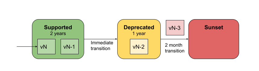 The following table lists the specific deprecation and sunset dates for each version. We encourage you to migrate to the newest version as soon as possible after its release.