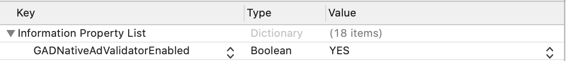 [[["Easy to understand","easyToUnderstand","thumb-up"],["Solved my problem","solvedMyProblem","thumb-up"],["Other","otherUp","thumb-up"]],[["Missing the information I need","missingTheInformationINeed","thumb-down"],["Too complicated / too many steps","tooComplicatedTooManySteps","thumb-down"],["Out of date","outOfDate","thumb-down"],["Samples / code issue","samplesCodeIssue","thumb-down"],["Other","otherDown","thumb-down"]],["Last updated 2026-01-09 UTC."],[],["Native Validator, available in Google Mobile Ads SDK 7.68.0 or higher, identifies AdMob policy violations in native ad placements within test ads. It displays an overlay popup next to the ad, alerting users to potential issues and providing a fullscreen list of violations when \"See Issues\" is clicked. Enabled by default for test ads on test devices, it can be disabled by setting `GADNativeAdValidatorEnabled` to `false` in the `Info.plist`, which prevents it from showing policy violations.\n"]]