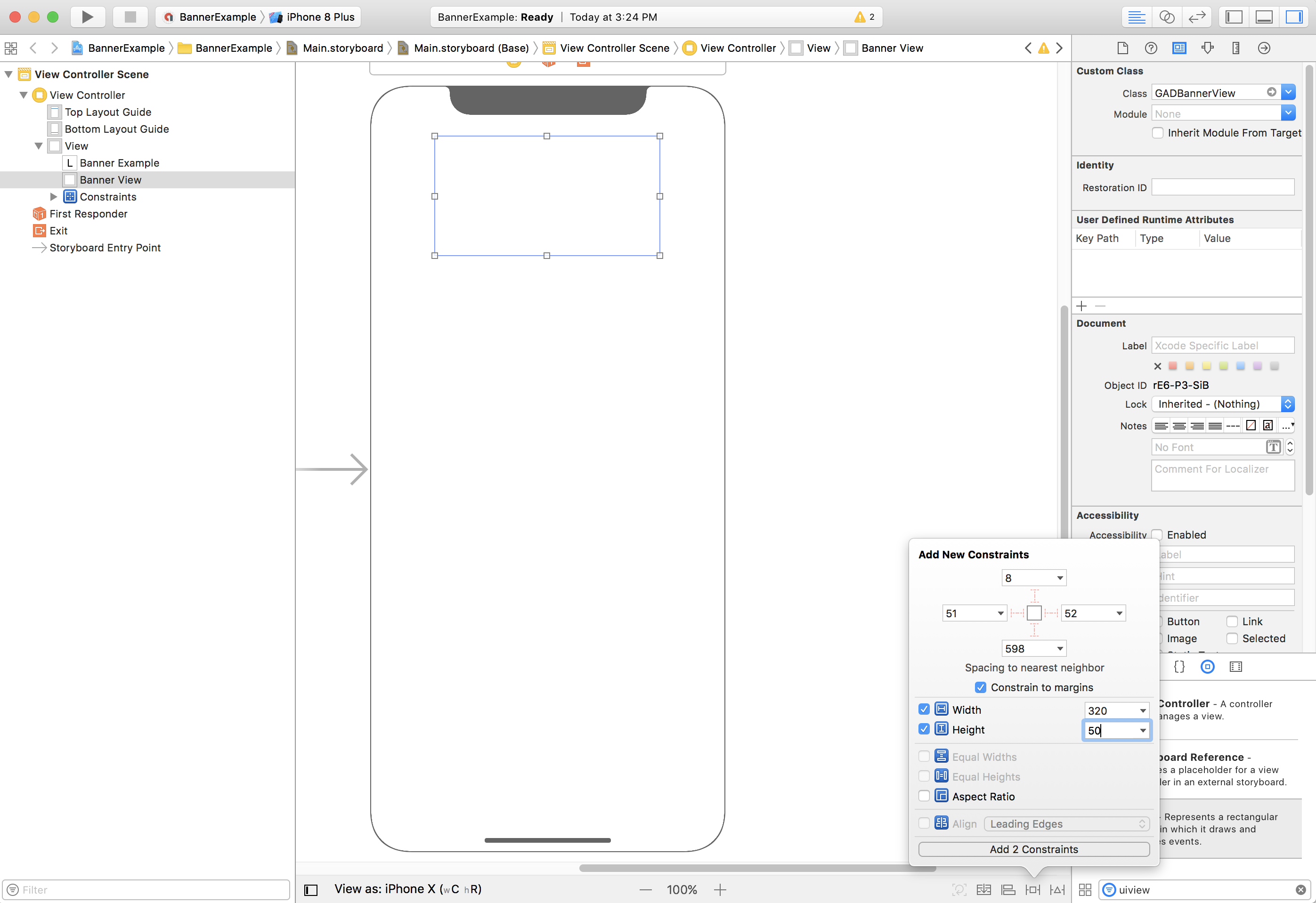 Banner ads must be placed in the "Safe Area" to avoid being obscured by rounded corners, sensor housing, and the Home indicator. On this page you'll find examples of how to add constraints to position a banner to the top or bottom of the Safe Area.