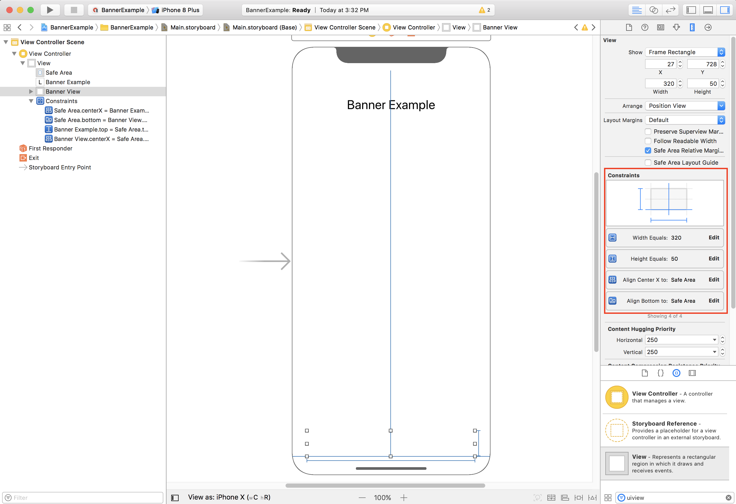 If your app creates banner ads programmatically, you can define constraints and position the banner ad in code. This example shows how to constrain a banner to be centered horizontally at the bottom of the Safe Area: