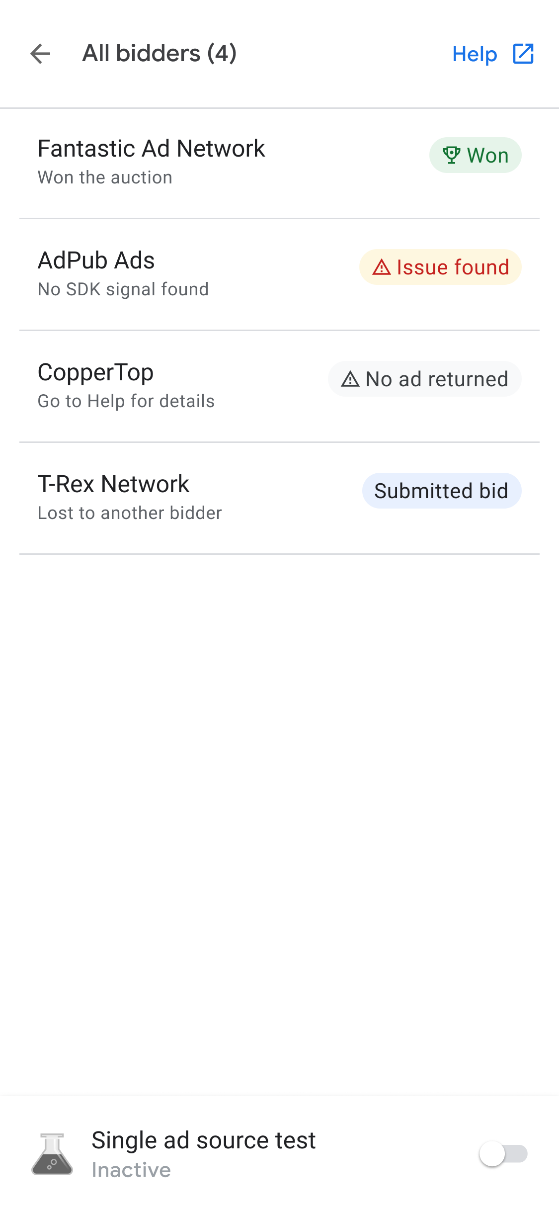 Issue found The ad sources with issues. For troubleshooting steps, see Bidding FAQ.