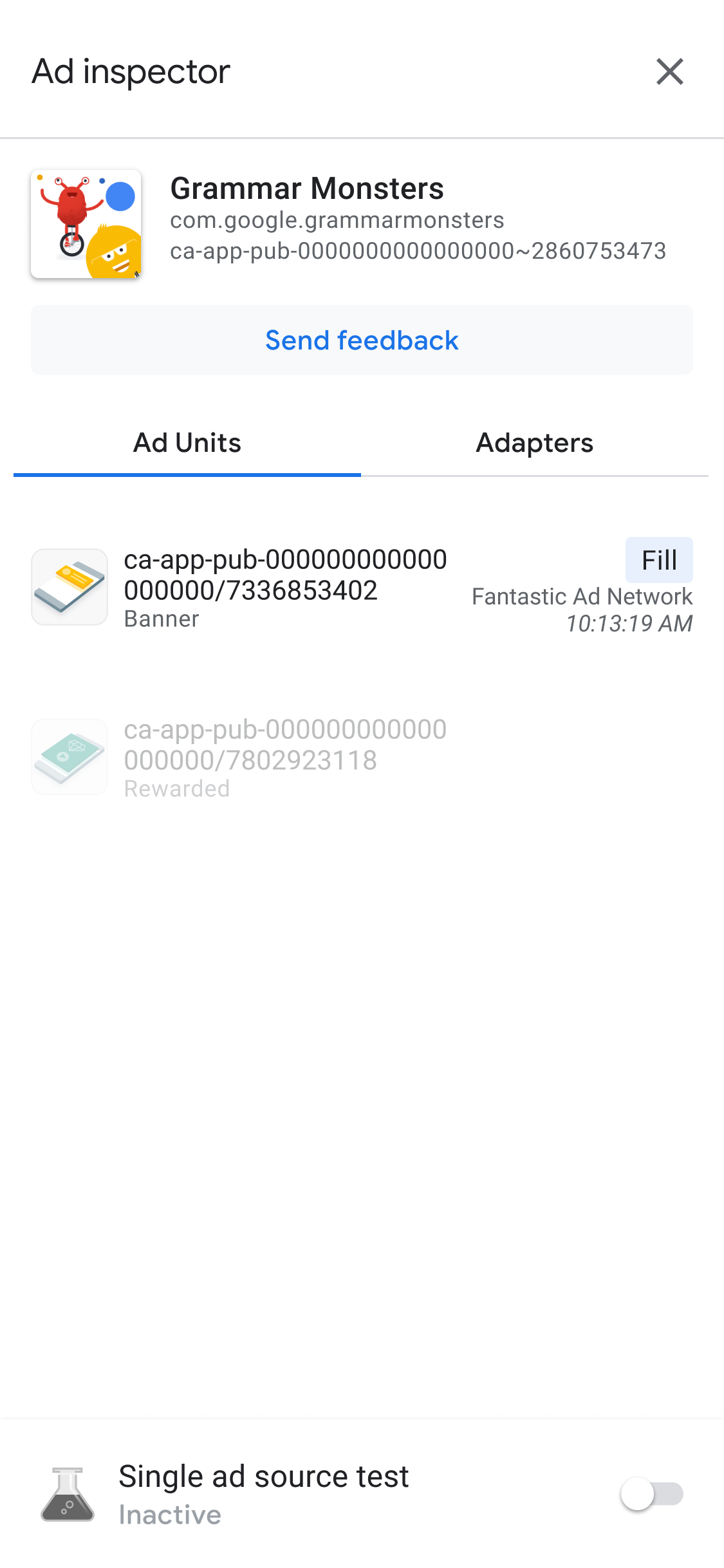 This page contains a list of your ad units in the AdMob UI associated with your AdMob app ID . If the app requests ads from other ad units during a session, ad inspector displays these ad units.