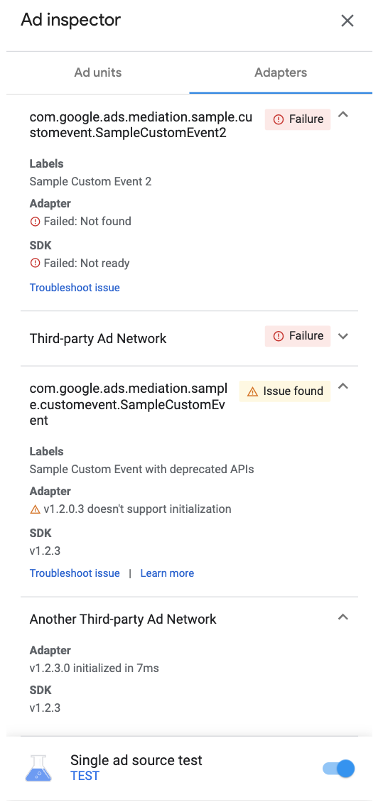 Earlier implementations of custom events, such as prior to the Google Mobile Ads Unity Plugin version 20.0.0 (Android) and 9.0.0 (iOS), can use deprecated subclasses that don't support initialization and return Issue found within ad inspector. If you see the Issue found warning, and your custom event integration works as expected, check if your app is using a deprecated interface and replace the interface with an adapter class. For details, see Adapter (Android) | GADMediationAdapter (iOS).