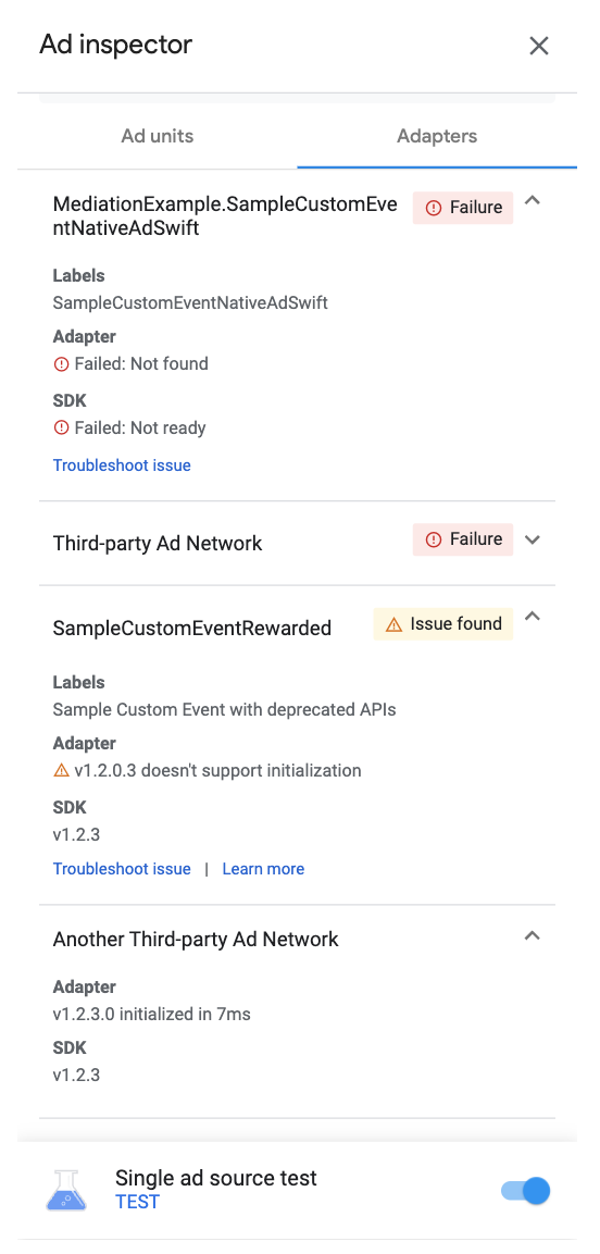 2. Expand the cards to view initialization statuses and adapter and third-party SDK versions.