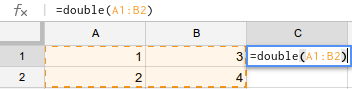 =DOUBLE(A1:B10)), the argument will be a two-dimensional array of the cells' values. For example, in the screenshot below, the arguments in=DOUBLE(A1:B2)are interpreted by Apps Script asdouble([[1,3],[2,4]]). Note that the sample code forDOUBLEfrom above would need to be modified to accept an array as input.