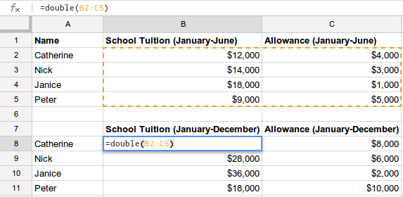 =) followed by the function name and any input value — for example,=DOUBLE(A1)— and press Enter. - The cell will momentarily display