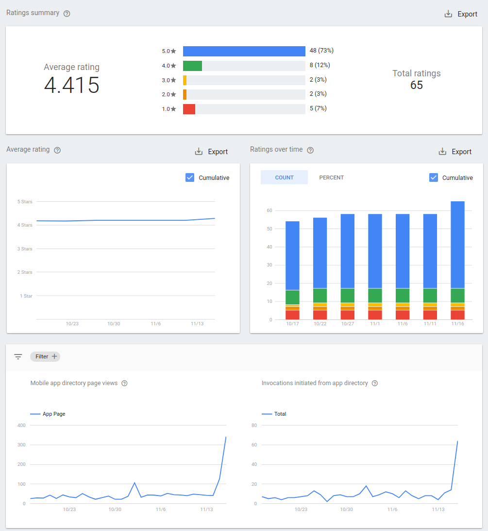 - Ratings summary: Your Action's average rating, total number of ratings, and number of users who rated your Action at each score.