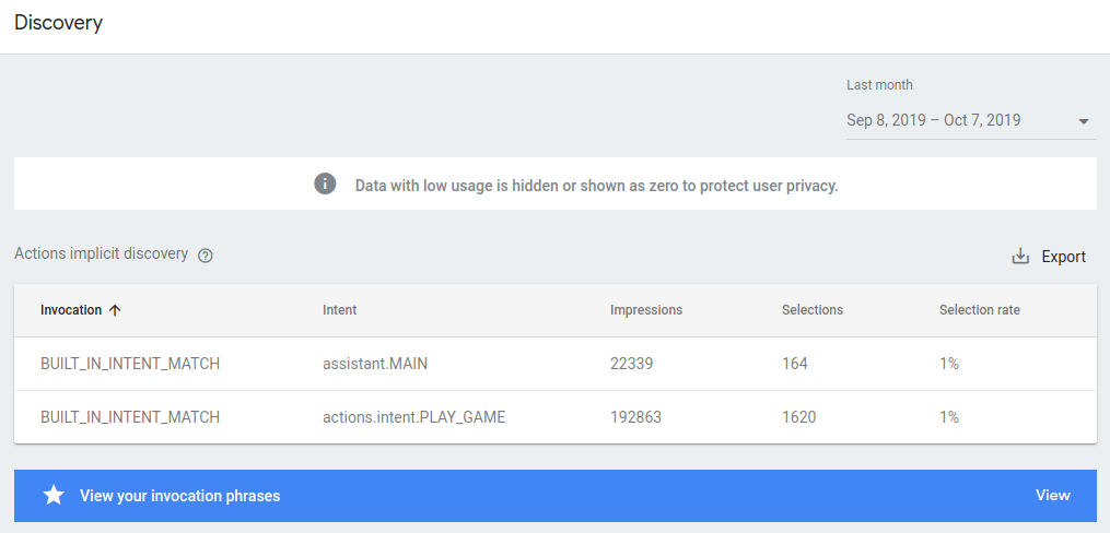 - Invocations initiated from Assistant directory: The number of times your Action has been invoked by the user pressing the "Try it" button in the directory. Invocations can be filtered by Action, country/region, and other useful categorization options.