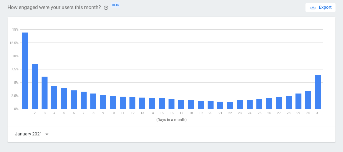 The user engagement graph shows how your users engaged with your Action during a selected month. Commonly known as a power user curve, this graph allows you to see how many of your users are "power users", meaning dedicated users who engage with your Action regularly, by plotting the percentage of users engaging with your Action by the days in the month.