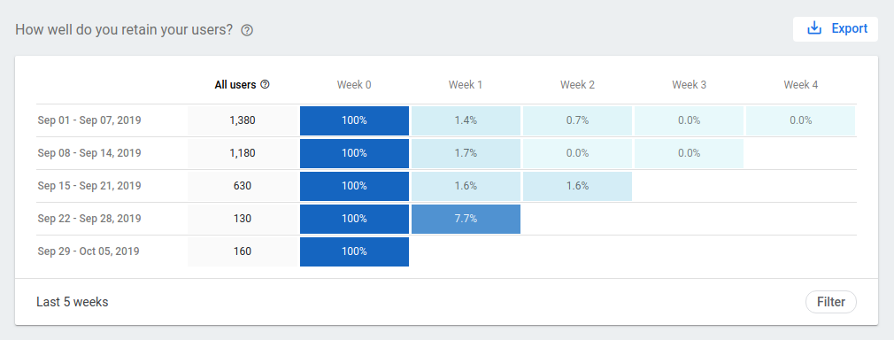 This graph shows user retention for the last five weeks. This includes all users (including new users) that have used your Action.