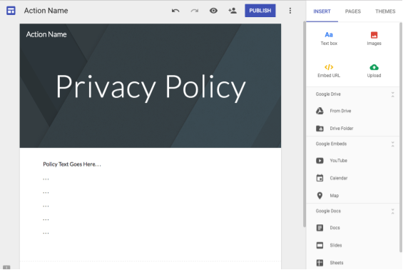 Google Sites is a recommended platform for creating and hosting a privacy policy for your Action.