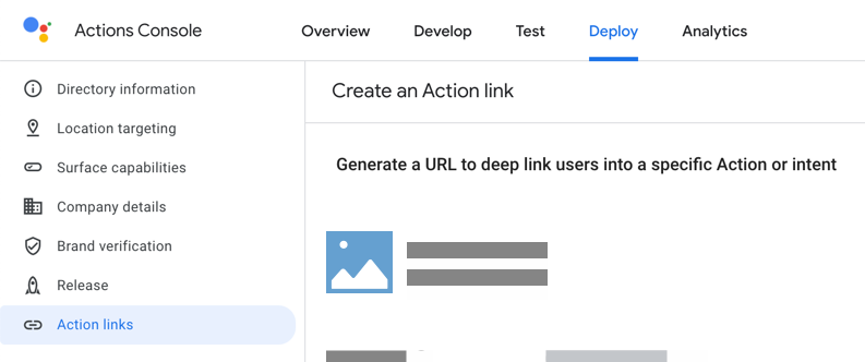 - Assistant links: Specialized URLs that point to specific intents with your Action.