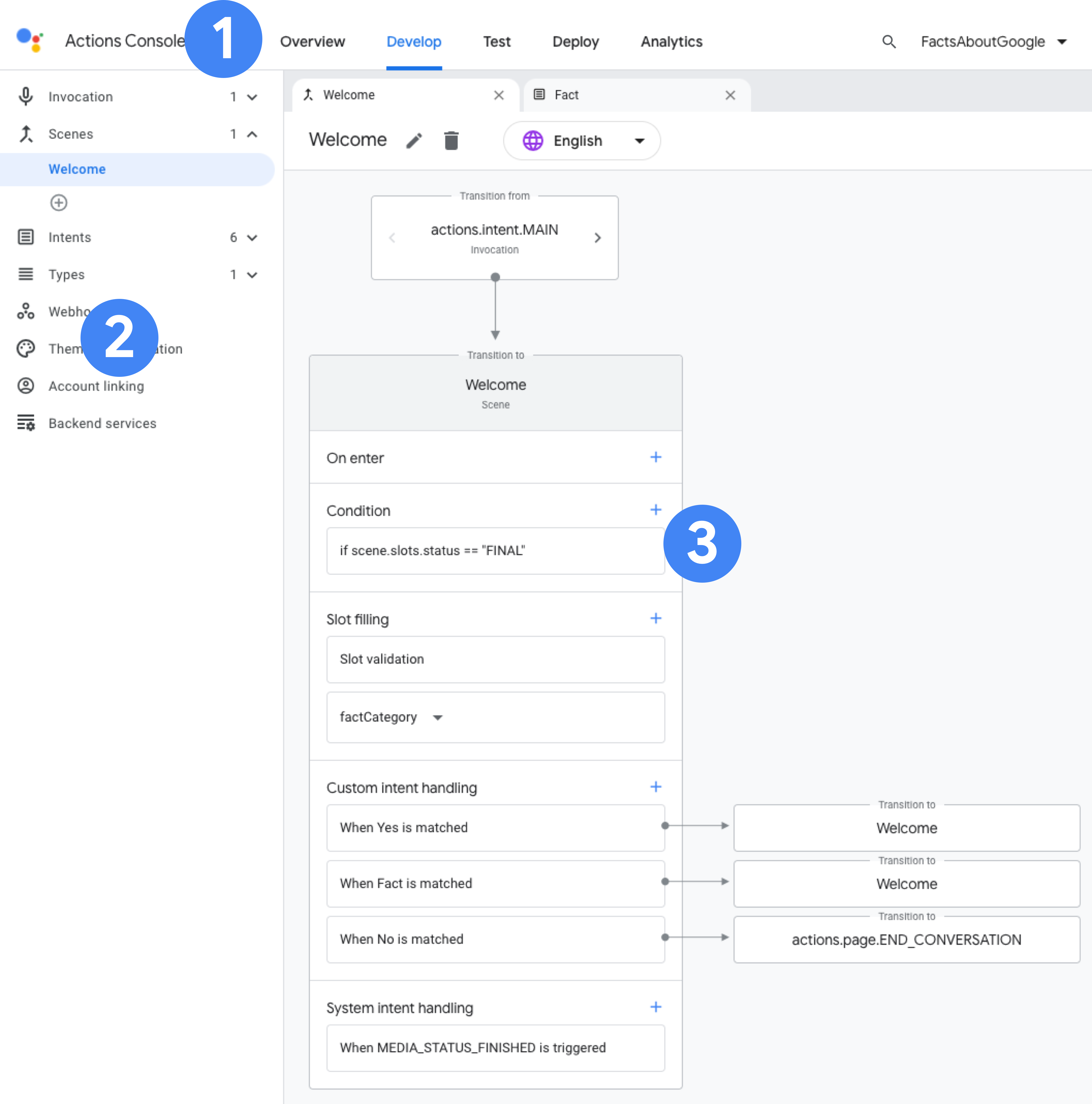 The Develop section of the console houses the visual web-based IDE, Actions Builder, which is built on top of the Actions SDK.