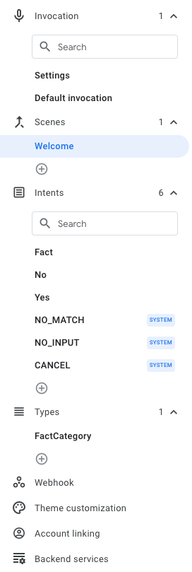 The element panel displays the currently selected scene, intent, or type. In addition, this panel displays options for invocation, webhook, theme customization, account linking, and backend services, when selected in the left menu.
