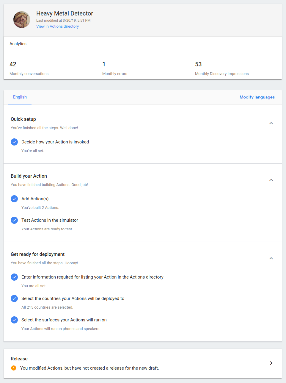 The Overview page provides a brief view of your Action's analytics and quick setup, build, and deployment options. The headings in each section take you to the related page in the other sections of the console.