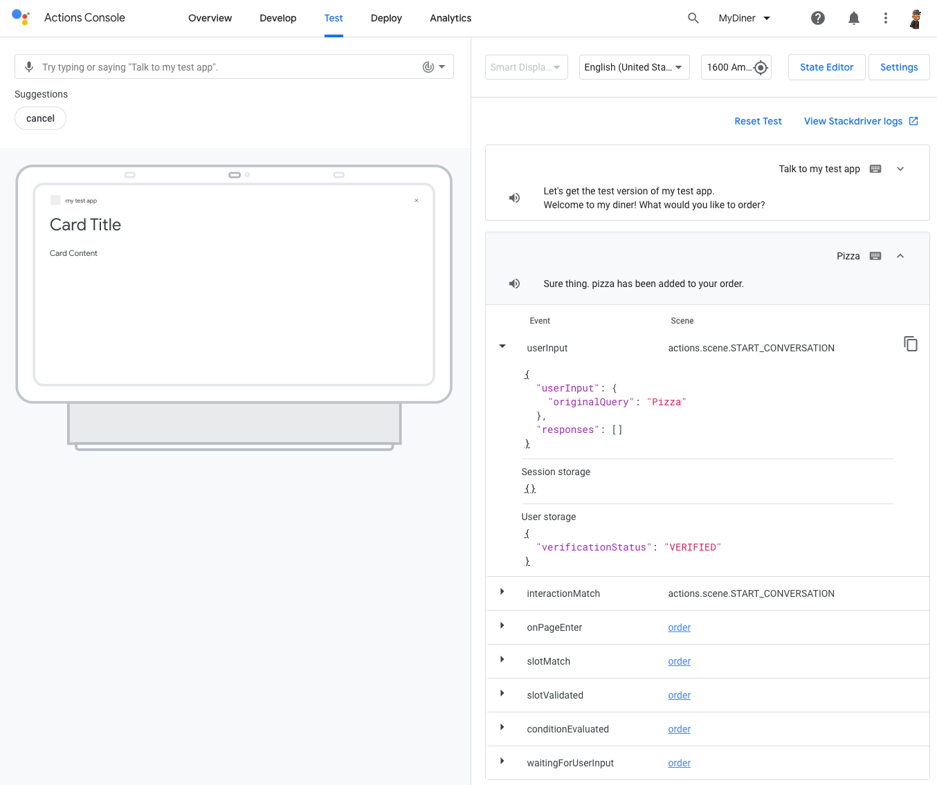 In the main navigation area, click Test to go to the simulator for testing your Action.