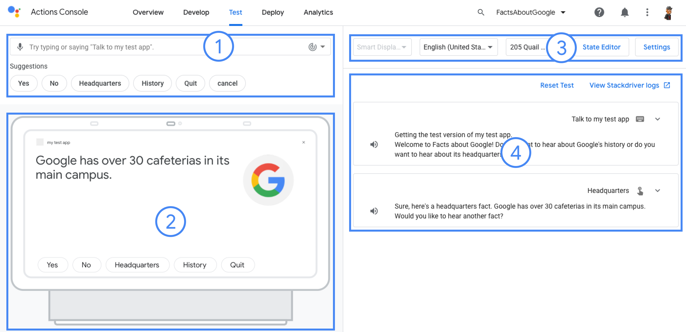 The Actions console provides a simulator to preview your Actions in. The simulator lets you see debug information, set device capabilities, simulate locale, and more.