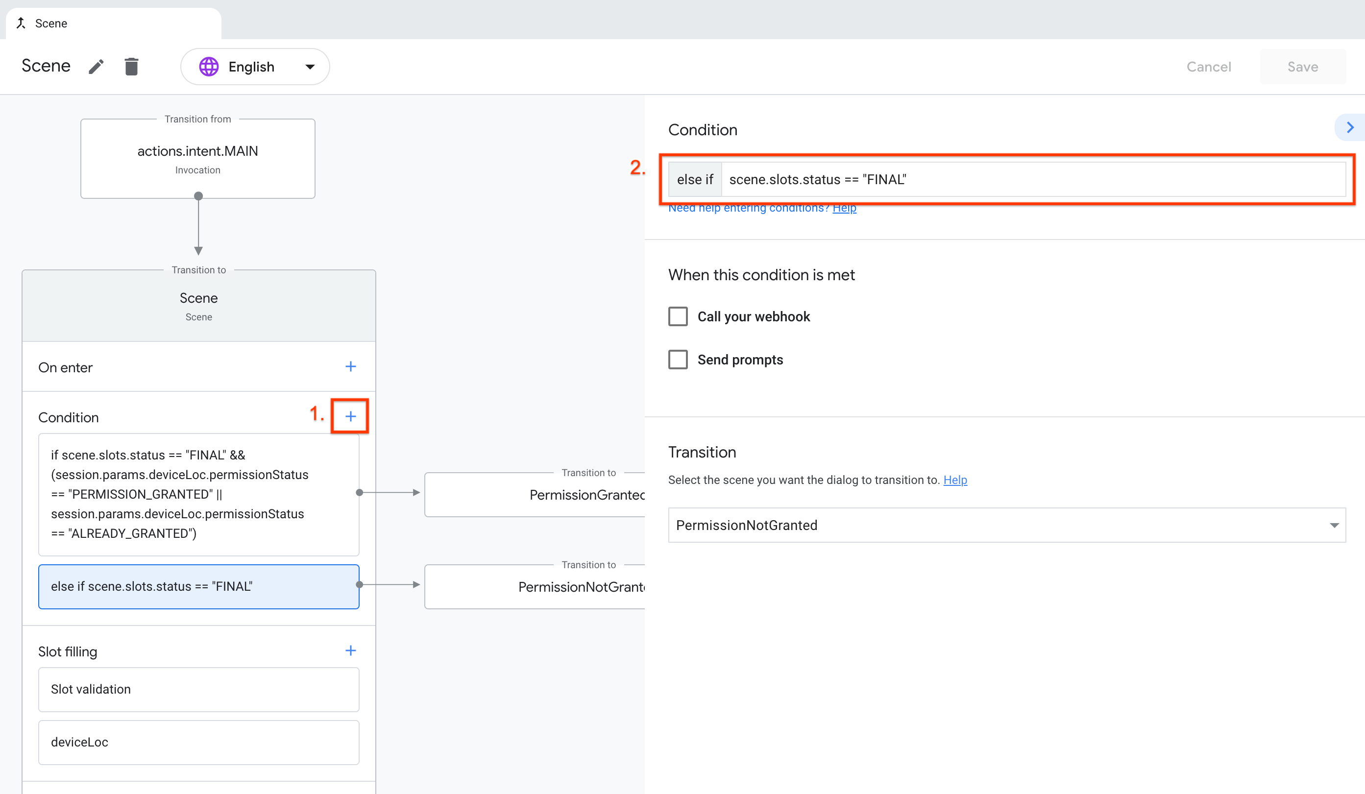 session.params.<slot_name>.permissionStatus in the condition of a scene.