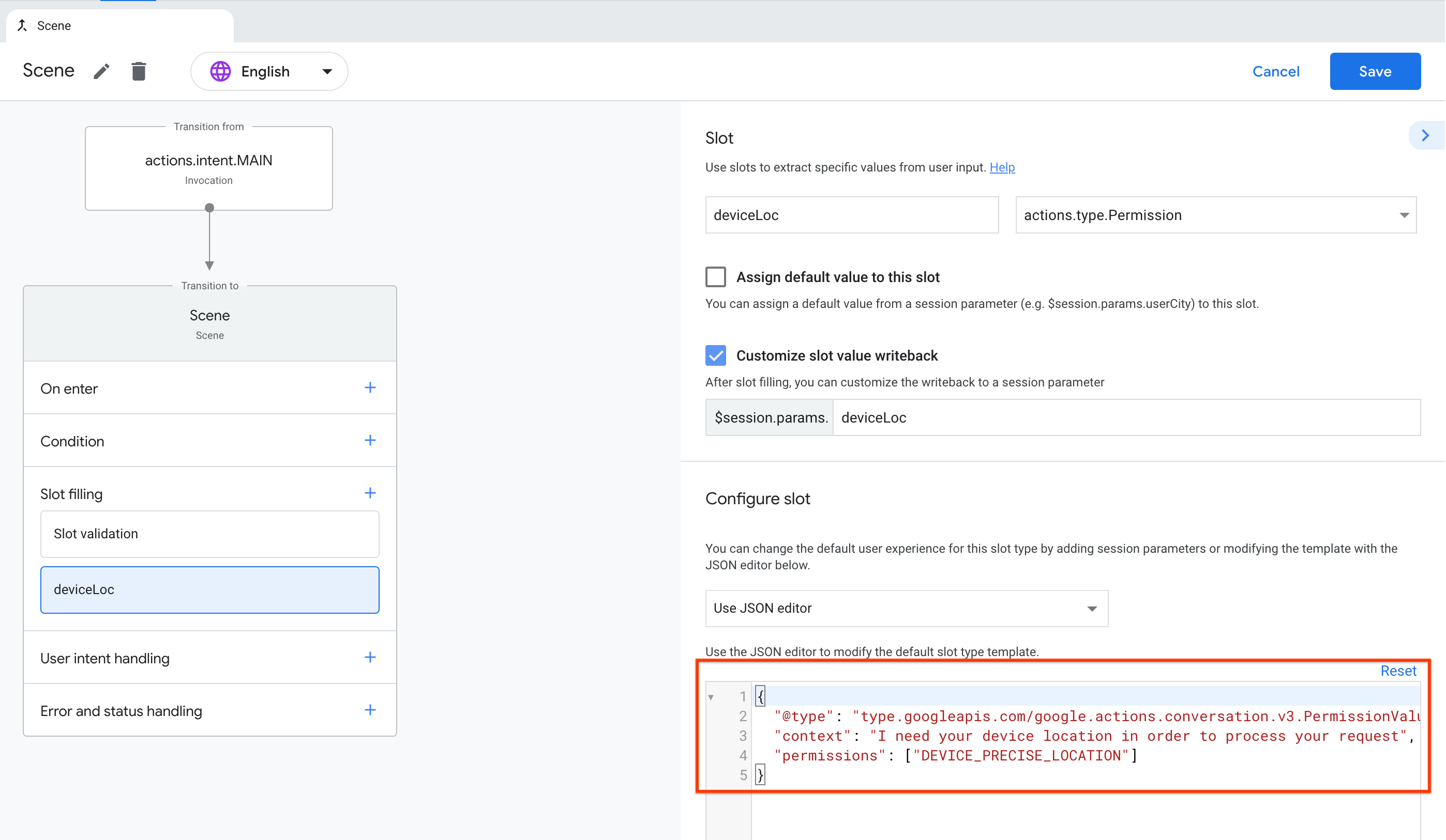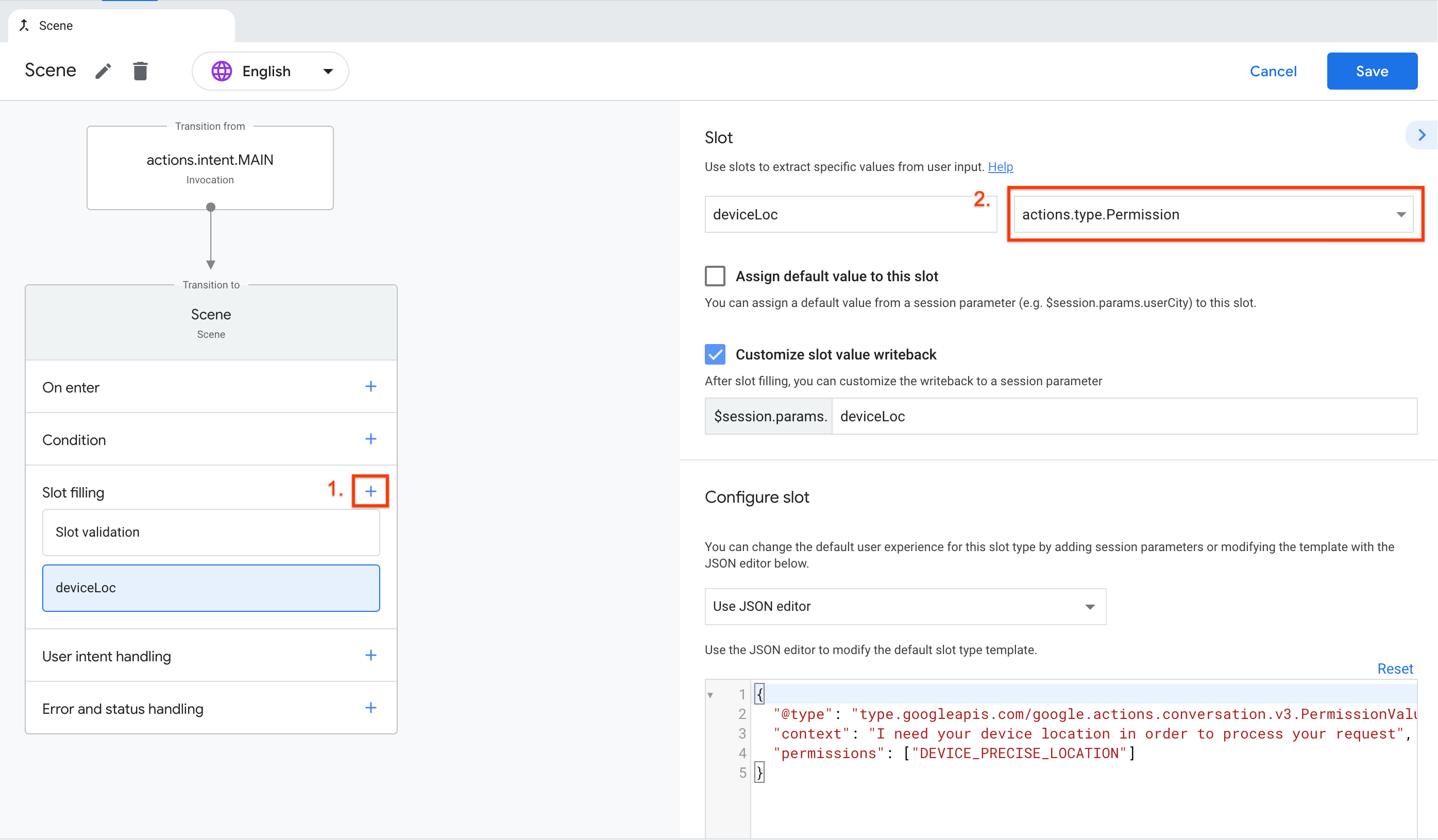 To set up permissions for your Action, you add a new slot type to the scene. You then configure the slot for the data permission you want to request.
