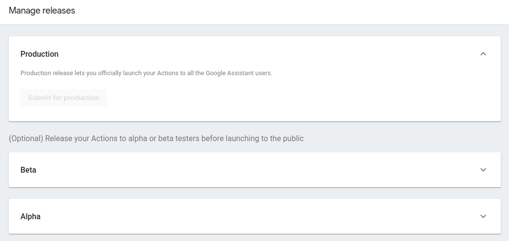 The Alpha release channel allows you to release your Action to a set of 20 developer-specified users who can then test your Action through Google Assistant devices. Alpha releases are ideal for internal testing, as the release does not require Google’s Action review process. Alpha testers get immediate access to your Action when it is released to this channel.