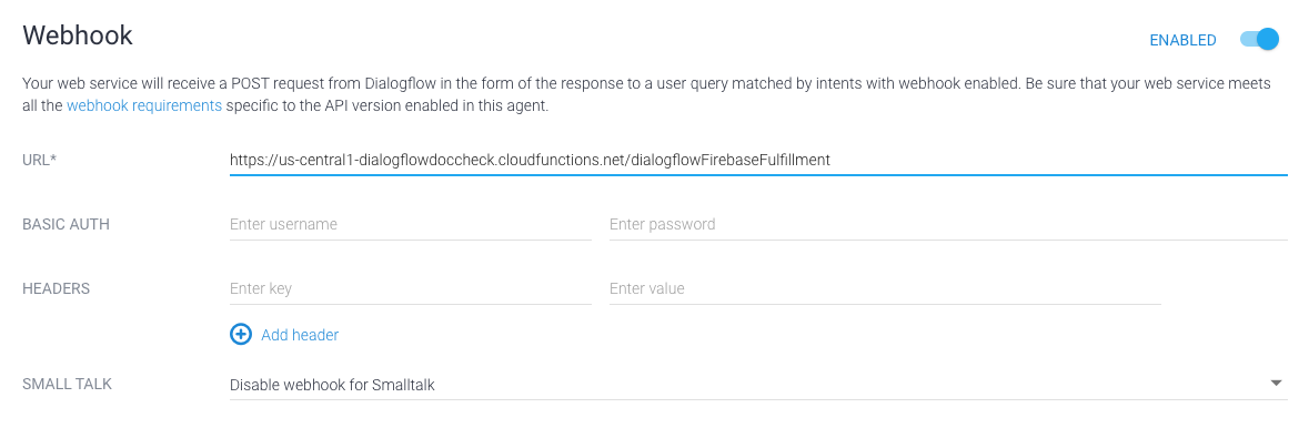 If you're using Dialogflow: In the Dialogflow console, go to Fulfillment, toggle the Webhook button to ENABLED, and replace the url in the URL field with your Function URL.