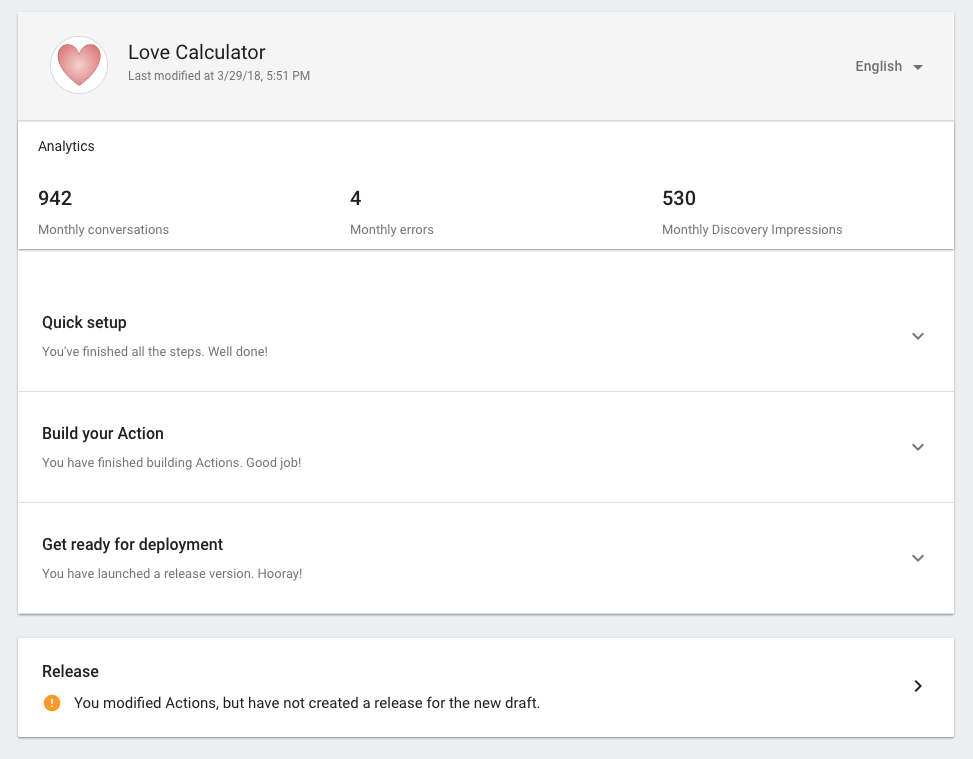 Go to the Actions console and create a developer project. The project lets you define metadata about your Action and manage and track your Action through the approval process. Once you have a project, you can create a Dialogflow agent that defines all your Actions.
