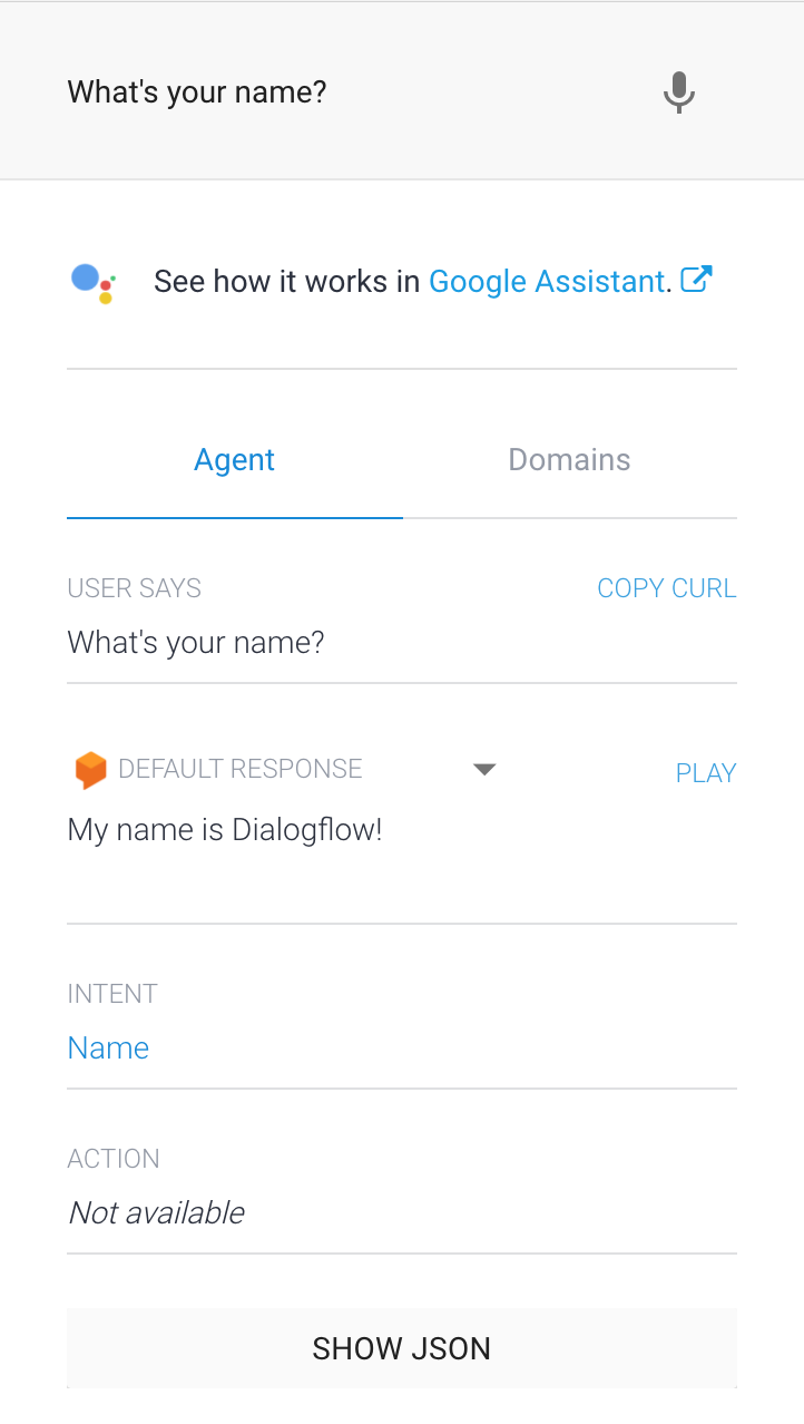 To test your new Name intent, in the Dialogflow simulator, type "What's your name?" and press enter.