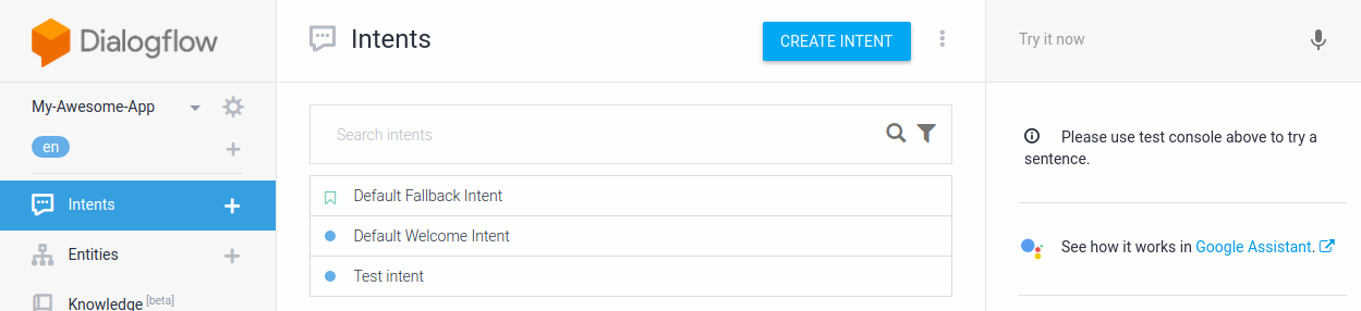 The Dialogflow simulator is on the right side of the page. The simulator lets you try out your agent by speaking or typing messages. In the Dialogflow simulator, click Try it now, type anything, and press enter.