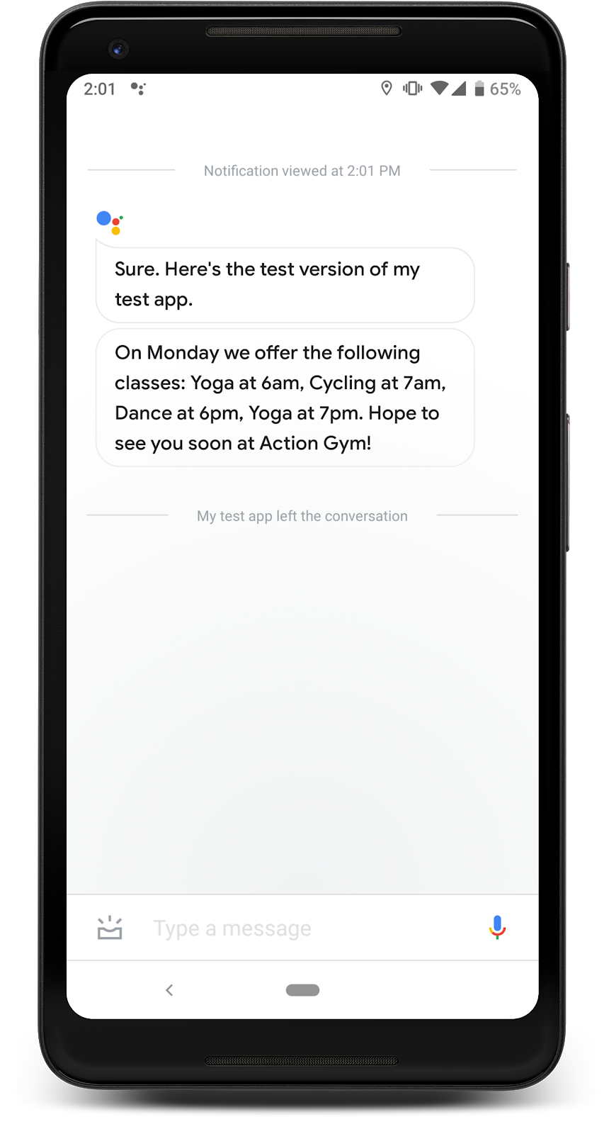 - When the user opens this notification, they invoke the intent that you configured as a daily update and interact with your Action.