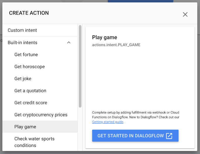 11. Under Built-in intents, select Play game and click Get started in Dialogflow.