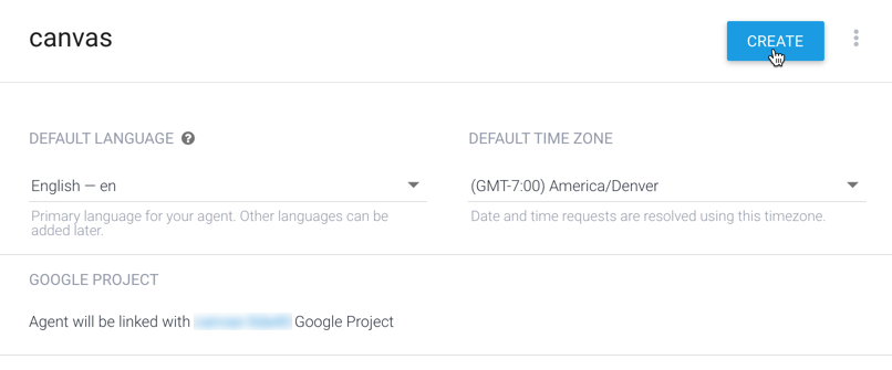 1. On the agent creation page, confirm the default language, time zone, and name for the agent and click CREATE.