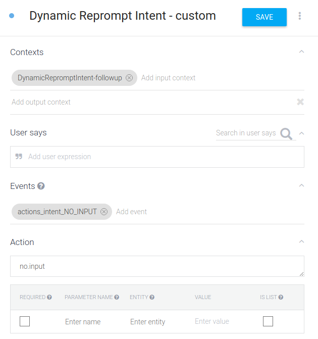 - Dynamic reprompts - Declaring that you want to handle reprompting on your own, and receiving an intent (Actions SDK) or event (Dialogflow) every time a no-input occurs, so you can handle them on a case-by-case basis.