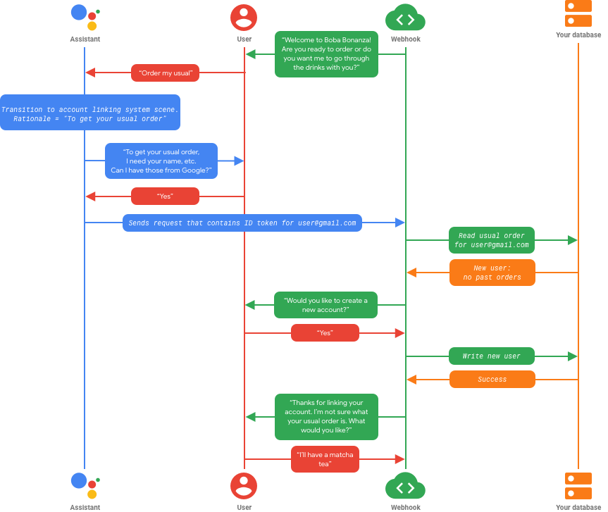 - If it does, the user has already signed into your system with their Google account. The user can continue the conversation with Assistant with their identity linked to their Google account.