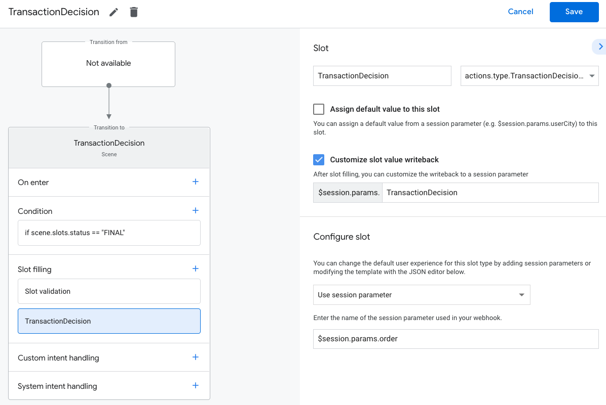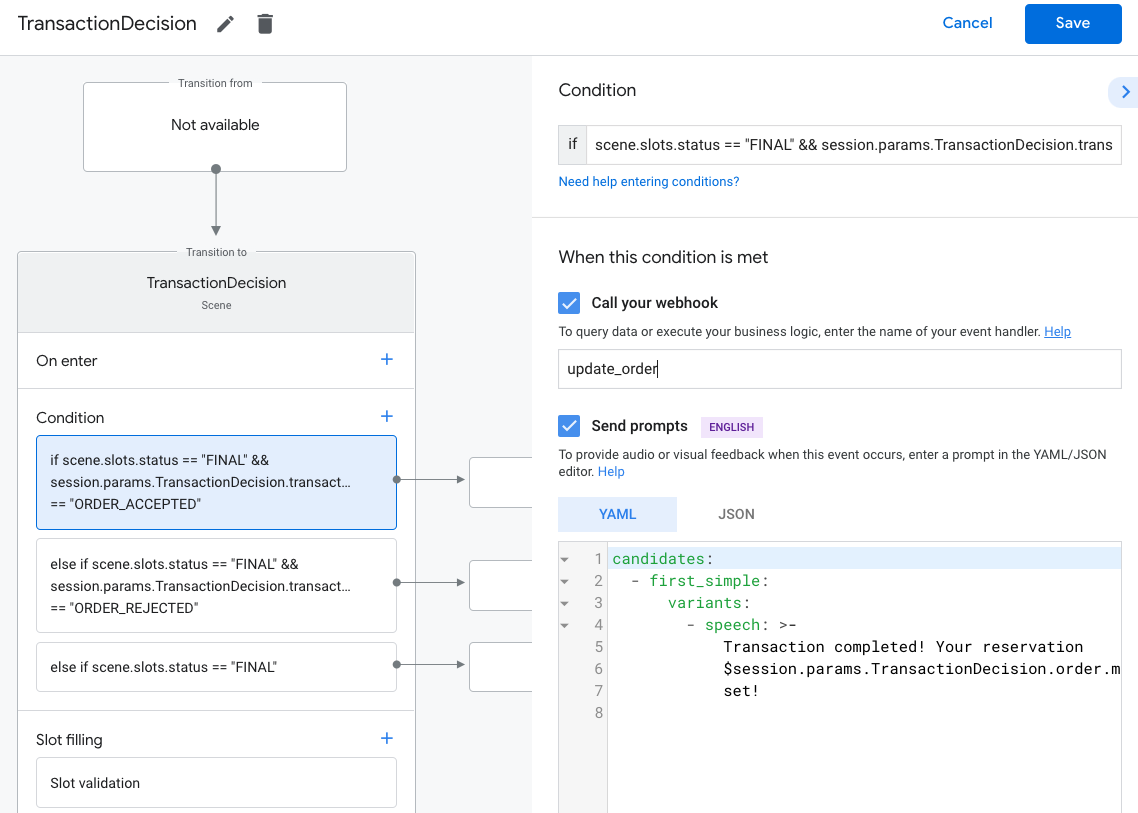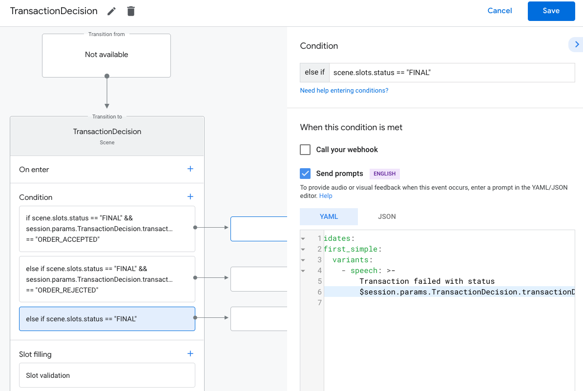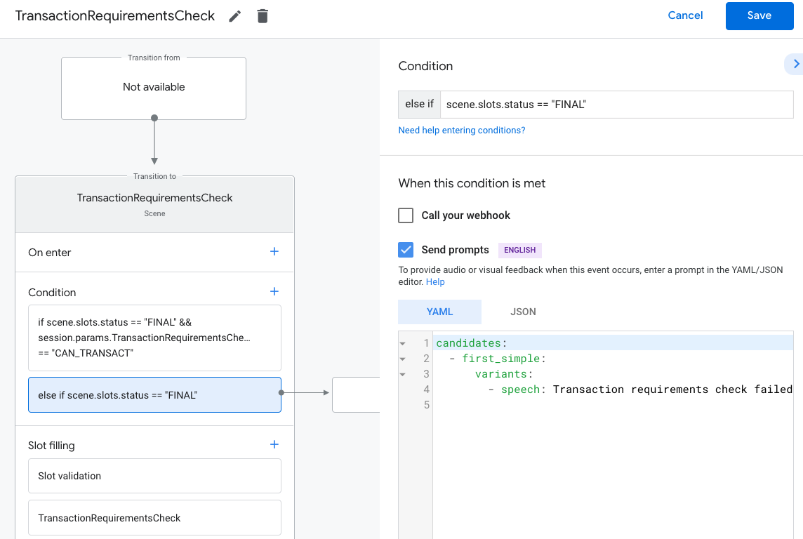 scene.slots.status == "FINAL" && session.params.TransactionRequirementsCheck.resultType == "CAN_TRANSACT"Hover your cursor over the condition you just added and click the up arrow to place it before